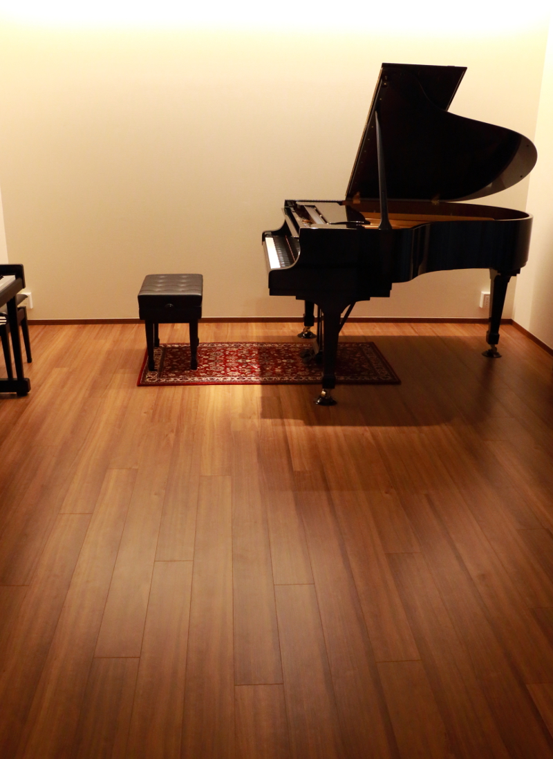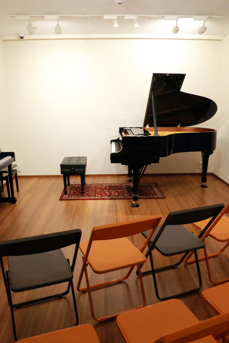 スタジオは、広さ約12畳。スタインウェイO-180とグロトリアン Model 110を備えています。 個人での練習はもちろんのこと、2台ピアノの練習や小規模編成の室内楽の練習 にもお使いいただけます(譜面台は6本あります)。